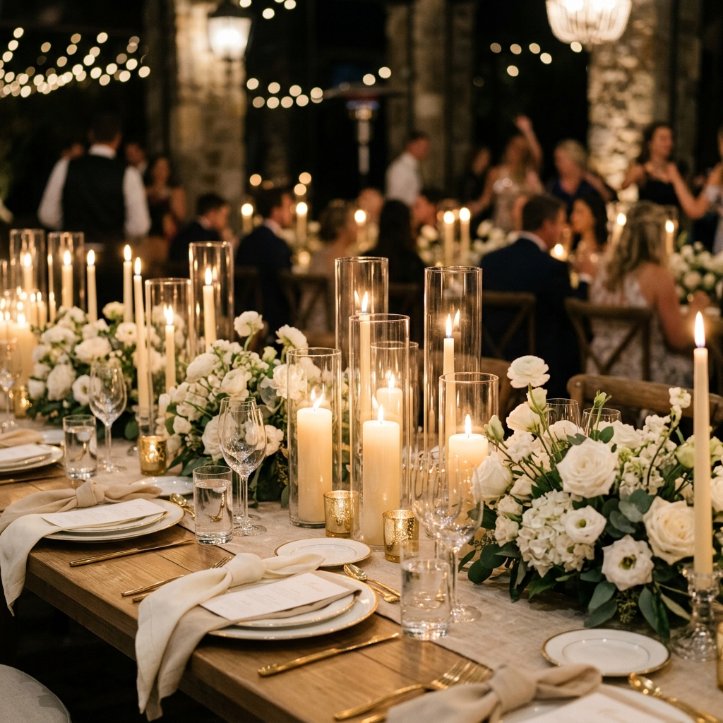 We source high-quality, dripless tapers, floating iterations, and statuesque pillar candles housed in curated glassware to perfectly complement your floral design. It is a striking visual layer that ensures your dinner reception glows effortlessly well into the late evening.